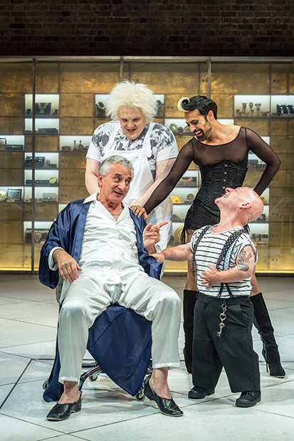 Trevor Nunn’s up-to-date version skilfully harmonises the Jacobean and the modern. The sickbed is an intensive-care unit where Volpone wilts into his pillows, a mass of diseased wrinkles, with his frail, bird-like skull lolling against the sheets. But once the coast is clear, he leaps up, whips off his wig and gown, and strides about in a shiny purple shirt like a youthful oligarch prowling a coke-den for crumpet. The transformation is hilarious. Volpone’s costumes and hair-piece by Stephen Brimson Lewis are minor miracles. Goodman also doubles as Scoto, a travelling pedlar, who dupes incautious buyers with fake medicines. He’s supported by a wily chief-of-staff, Mosca (Orion Lee, under-powered), and by a coterie of misfits including a dwarf, a eunuch and a hermaphrodite. Julian Hoult, as the emasculated Castrone, is terrific value.