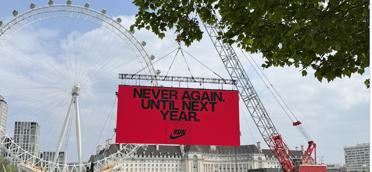 Yet when I saw the Nike advertisement – hoisted from a crane like an executed Iranian dissident, swaying precariously in front of that modern-day emblem of our capital city, the London Eye – bearing the slogan “Never again. Until next year,” my mind immediately traveled to darker places. What, I wondered, has a running race to do with the Holocaust?
