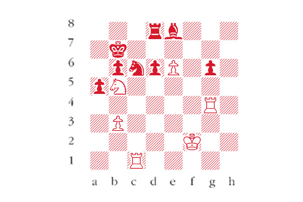 White to play. This position is a variation from Congdon–‘Heinsius’, online game 2014. White has a ferocious attack and now needs to land the killer blow. How can he achieve this? Answers to me at The Spectator by Tuesday 14 January or via email to victoria@spectator.co.uk or by fax on 020 7681 3773. The winner will be the first correct answer out of a hat, and each week I shall be offering a prize of £20. Please include a postal address and allow six weeks for prize delivery.