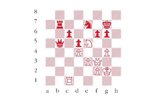 Black to play. This is from Kantans-Malakhov, Latvian Railway Open, Riga 2014. Black has achieved a tremendous build-up on the kingside with pressure on the g-file and along the h1-a8 diagonal. How did he make the most of these? Answers by Tuesday 22 April via email to victoria@spectator.co.uk or by fax on 020 7681 3773. The winner will be the first correct answer out of a hat, and each week I shall be offering a prize of £20. Please include a postal address and allow six weeks for prize delivery.