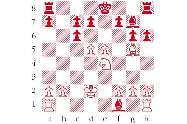 White to play. This position is from Yu–Ganguly, Indonesia 2012. This encounter also started with the Scotch Game opening. Both sides have a bishop en prise. How can White turn the tactics to his advantage? Answers to me at The Spectator by Tuesday 30 September or via email to victoria@spectator.co.uk or by fax on 020 7681 3773. The winner will be the first correct answer out of a hat, and each week I am offering a prize of £20. Please include a postal address and allow six weeks for prize delivery.