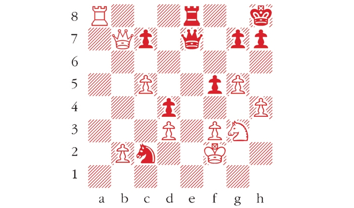 White to play. This is from Anand v Kramnik, Zurich Rapidplay 2015. White has two ways to win this position, both using the same idea. Either move can be considered the correct solution. Can you see the idea? Answers to me at The Spectator by Tuesday 24 February or via email to victoria@spectator.co.uk or by fax on 020 7681 3773. The winner will be the first correct answer out of a hat, and each week I am offering a prize of £20. Please include a postal address and allow six weeks for prize delivery.