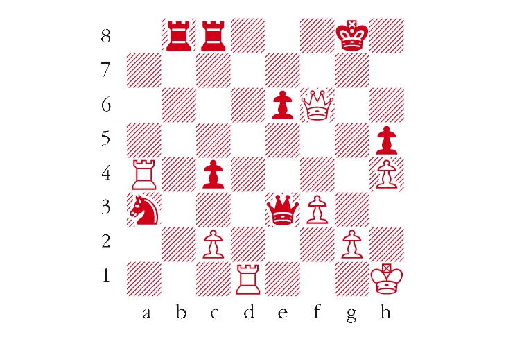 White to play. This is from Anand-Esserman, Isle of Man 2017. White now killed off the exposed black king. What was the key move? Answers to me at The Spectator by Tuesday 10 October or via email to victoria@spectator.co.uk. There is a prize of £20 for the first correct answer out of a hat. Please include a postal address and allow six weeks for prize delivery.