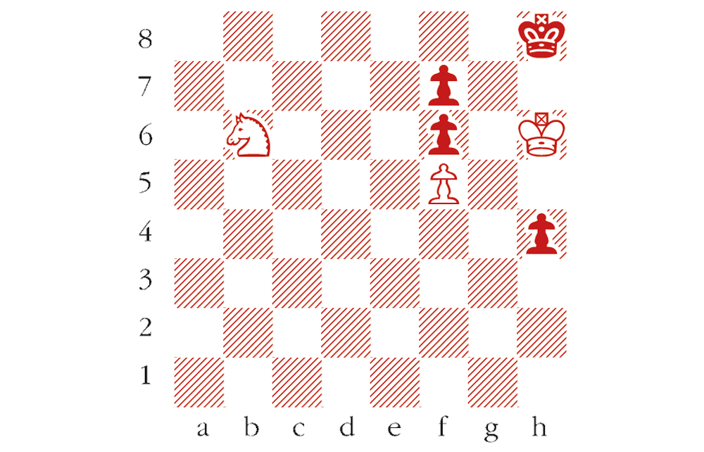 White to play and draw. Composed by A. Lifanov, 2002. The pawn on h4 looks unstoppable, but the draw is still within reach with an accurate sequence. What should White’s first move be? Email answers to chess@spectator.co.uk by Monday 3 April. There is a prize of £20 for the first correct answer out of a hat. Please include a postal address and allow six weeks for prize delivery.