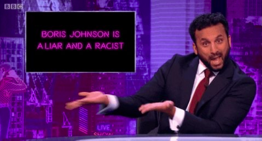 The Mash Report was all of this and then some. In response to the show’s canning, Kumar has tweeted a pic of him from the show gesturing to a graphic that reads ‘BORIS JOHNSON IS A LIAR AND A RACIST’. Which is basically his comedy, such as it is, summed up.