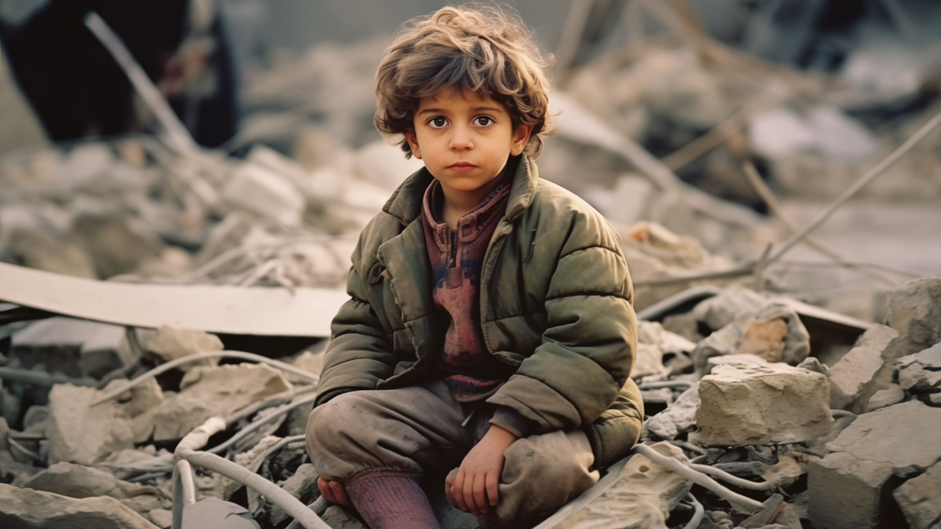 a colour photo of a single child sitting in destroyed house rubble in Palestine, a hauntingly beautiful portrait capturing the resilience and innocence of a child amidst the devastation…