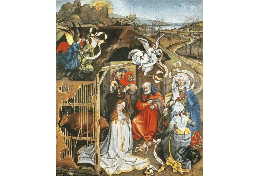 If so, it might explain an unusual aspect of the picture: the presence of two midwives. These, the richly dressed women on the right, do not feature in the gospels, but they were popular figures in mystery plays and religious storybooks. Allegedly, one, named Salome, doubted the virgin birth. The text swirling around her head in the Dijon picture — the 15th-century equivalent of a speech bubble — reads: ‘I believe it only when I have proved it.’ She was instantly punished for this aspersion by the withering of a hand (the one she is holding out). But at this point an angel appeared, proclaiming: ‘Touch the boy and you will be cured.’ Azel, the other, more pious midwife kneels in wonder.