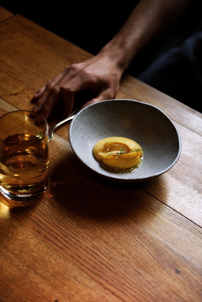 Saffron bell pepper soup comes in a gorgeous but slightly impractical ceramic vessel. The half I don’t spill down my shirt is exquisite. Next, shallots and dried rose, with buttermilk leftover from my rye sourdough’s spread. Local duck next, and cherry fizz wine. “Get that in your mouth then have a sip of that,” my server giggles. I oblige, and it’s beautiful.
