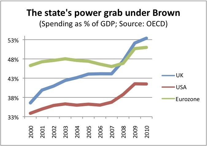 Gordon Brown may have been defeated, but you can hear his voice in the broadcast reports this morning about the £6 billion cuts which George Osborne will mention today. The BBC was still expressing this in terms of frontline service cuts – the equivalent of 150 schools, apparently. This was the root intellectual error which sent Britain on the path of fiscal ruin – the idea that extra spending magically means extra, better services. If that were true, Britain should have the best schools on the planet and healthiest population in the world, given that our spending over the last decade years increased, quite literally, faster than any other country over any other postwar decade*.