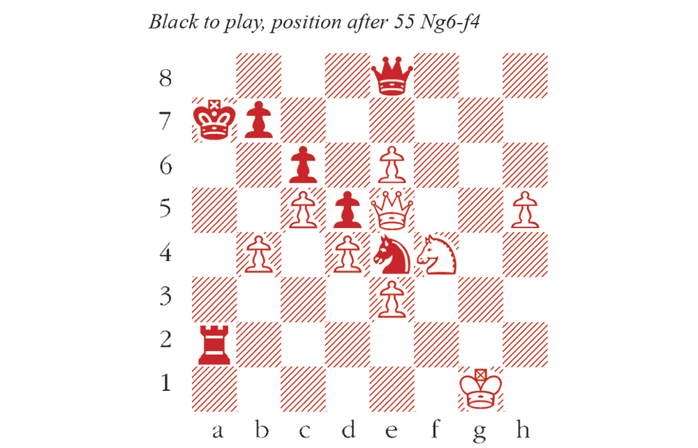 But a curious case arose in the following game from the ECU Senior Championships, which concluded in Acqui Terme last weekend. Almost 20 moves earlier, White sacrificed a rook and hounded Keith Arkell’s king from the kingside all the way to a7. Now it is safe, and Arkell remains a rook up, but both players were down to about a minute or so, and it remains far from obvious how to combat the passed pawns on h5 and e6. 55…Nd2 looks tempting, but 56 Qg7 dodges Nd2-f3+ and prepares to trundle the h-pawn forward. Careful analysis shows some subtle ways to win, e.g. 55…Qg8+ 56 Ng6 appears to restrain the queen, but then 56…Qd8 57 e7 Qd7! 56 e8=Q Qg4+ and mate follows.