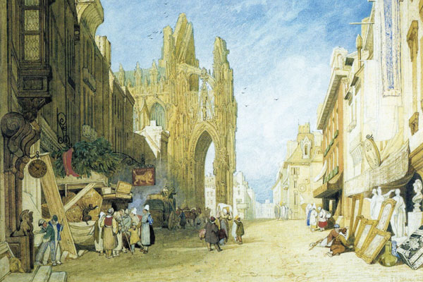 John Sell Cotman (1782–1842) is a key figure in the great tradition of English watercolour painting. A prominent member of the Norwich School (he was born in the city), he was a landscape painter of genius, who transcended mere topographical record by making paintings of superb abstract design which also evoke the particularity of place. He could suggest space and light and weather with the lightest and broadest of touches, in images that look curiously modern, if not timeless. He earned a living by teaching and travelling, making saleable studies of antiquities, many of which were reproduced as etchings. Between 1810 and 1821 he focused on the architecture of Norfolk and Normandy, and it is from this work that the exhibition is drawn.
