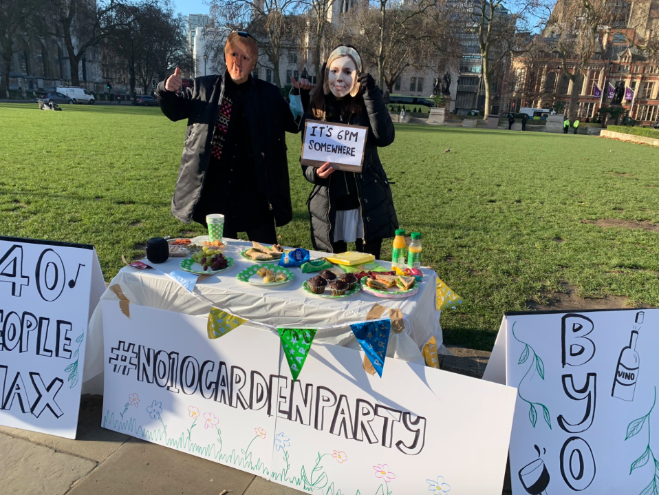 Accompanied by home-made signs declaring ‘Maximum of 40 people’ ‘It’s 6pm somewhere’ ‘#No10GardenParty’ and ‘BYOB’ the impromptu garden party was apparently of their own initiative and makes a welcome change from the usual bellowing of ‘Stop Brexit man’ Steve Bray.
