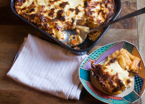This isn’t your average student pasta bake: slow-cooked ragu, a topping cooked at a hot temperature until blackened in places and blistering; a time investment that means delayed gratification, but for the most part can be left to its own devices, to simmer, to bubble, to bake. Saucy and deeply savoury, hot and packed with carbs: it can’t fail to please.