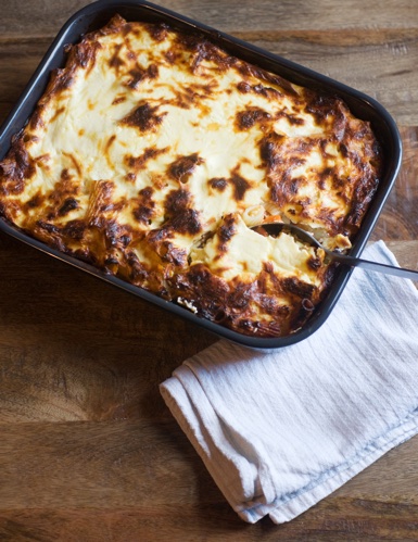 I don’t pretend for one moment that this dish tends towards authenticity; this is the pasta bake of my 1990s childhood in Northern England, peered at through oven doors, the smell winding up staircases. But it is loosely based on the Greek pastitsio, a baked pasta dish made with minced lamb and topped with a dairy-based sauce.