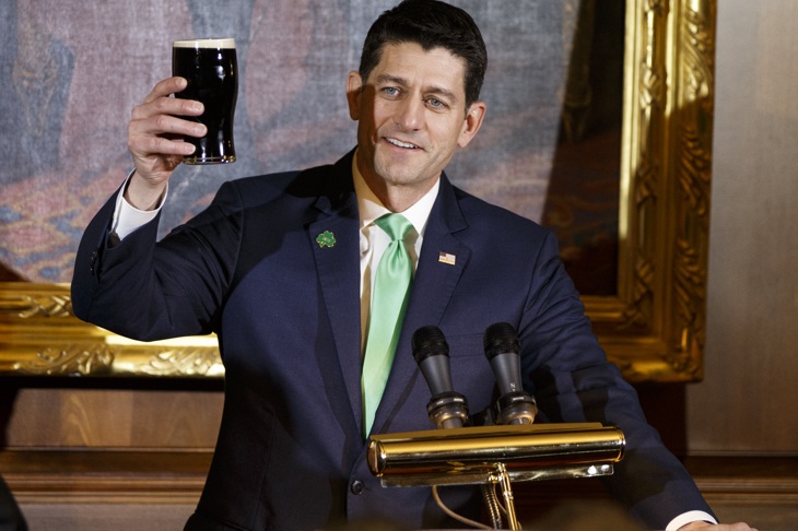 WASHINGTON, DC – MARCH 15: (AFP OUT) United States Speaker of the House of Representatives Paul Ryan, Republican of Wisconsin, holds up a pint of Guinness as he proposes a toast during the Friends of Ireland luncheon at the United States Capitol March 15, 2018 in Washington, DC. . The Taoiseach is visiting as part of the traditional St Patrick’s Day celebrations (Photo by Alex Edelman-Pool/Getty Images)