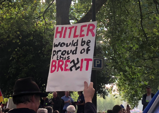 It’s the day of the People’s Vote march and over half a million protesters are estimated to have descended on the capital to call for a second referendum. The pro-EU protesters have brought with them a range of placards – while some parents have opted to simply save paper and write pro-EU slogans on their children’s backs.