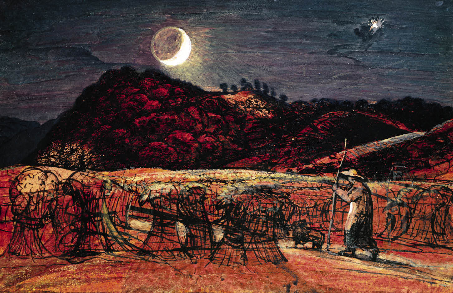 Palmer was a youthful prodigy and his finest and best-known paintings, such as ‘The Magic Apple Tree’, ‘Coming from Evening Church’, ‘The Gleaning Field’ and ‘In a Shoreham Garden’, were done in Shoreham, Kent, over a short, highly productive period when he was in his mid twenties. Many of them were never exhibited during his life but hidden away in what he called his ‘Curiosity Portfolio’. A long honeymoon spent travelling in Italy from 1837 to 1839 did not result, as he had hoped, in a new and financially successful phase in his career. Studying old masters may have taught him a little more about figure- drawing, but by the time he got back to England, public taste had long since moved on from Italy to the Orient. ‘Italy has been painted out and out,’ the Athenaeum had loftily declared, ‘and we are weary of its splendid scenes and contemptible people.’