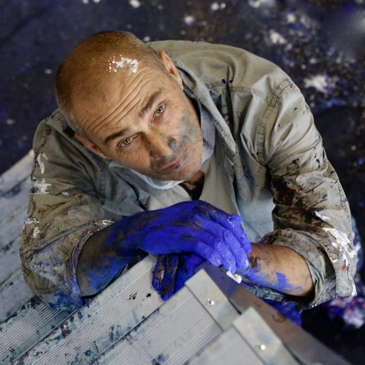 Pastor’s latest works, installed to coincide with Climate Week in New York, are a clear indication of where he sees the state of play. The first enormous canvas, ominously titled La Fin Du Monde, seems to depict an apocalyptic clash of water, fire and ice. Heavy brush strokes are densely laid on with glue and pigment, giving a sense of the swirling waters enveloping us all. “I start the paintings with a story in my mind,” he said, speaking from his studio — a former seventeenth-century farm near Cadaqués. “With these pieces I analyze the color and the proportion of the colors, take the pigment, my natural glue and complete it within forty five minutes.” What follows, however, is the most important part: the paintings are brought outside the studio and left to the elements, sometimes for as long as twenty days, for the water to run, the pigment to be blown by the wind and the canvas to be baked by the sun. He adds, “The rain, the sun, the wind on the painting give a touch that no human being could dream of.”