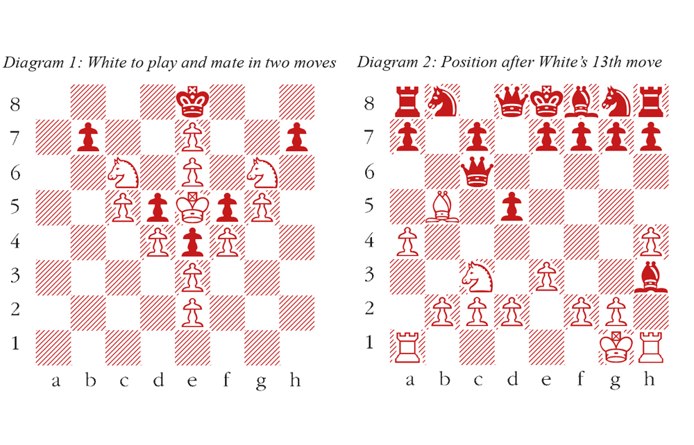 The second diagram shows a ‘proof game’, presented as a problem in Riga, and composed by Markus Ott in 1983. The diagram shows the position after white’s 13th move, and the task is simply to deduce all the moves from the start position up to the diagram. This is well worth attempting, but harder than it looks, although evidently, the pawn from b7 must have promoted to a queen. The solution reveals a very neat surprise.