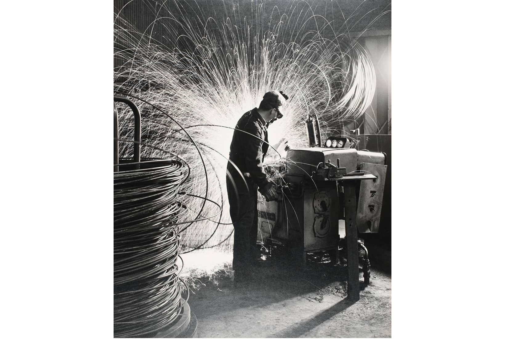 When he returned to the factories after the war, it was as a photographer. He shot workers bottling salad cream in Bermondsey, and buffing a ship’s propeller in Glasgow; in one series of more than 100 prints he turned the camera on the hidden entrails of his own art, documenting the factories where Ilford Ltd made photo paper and glass plate negatives. But his greatest works were the ones made of nothing but heat and fire. In ‘Tapping a Furnace’ (1954), shot at the Ford plant in Dagenham, a single figure stands in a vast empty space, emptying molten steel from a crucible. No light, except the volcanic glow of the furnace: pure livid potential. In ‘Wire Manufacture’ (1964) a worker stands at a machine cutting wire, but the metal coils dissolve into the halo of wild sparks around him. There’s a cathedral-like grandeur in these photos, something Promethean: tiny human figures, in control of so much raw fire. But they were never really in control: Maurice Broomfield was. He made sure of that.