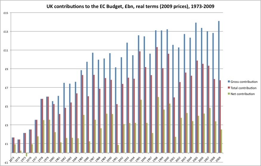 Answer: it depends on how you look at it. I’ve put together the chart below (click for a larger version), which sets how much money we’ve given the the EU since 1973. There are three lines for each year: i) our gross contribution, ii) our total contribution (which is the gross contribution minus the money we get back from the rebate), and iii) the net contribution (gross contribution minus both the rebate and the money that the Treasury gets to pay for various EU projects across the UK). In terms of how much the EU costs the taxpayer, then, I’d say the second line is the best one to follow: