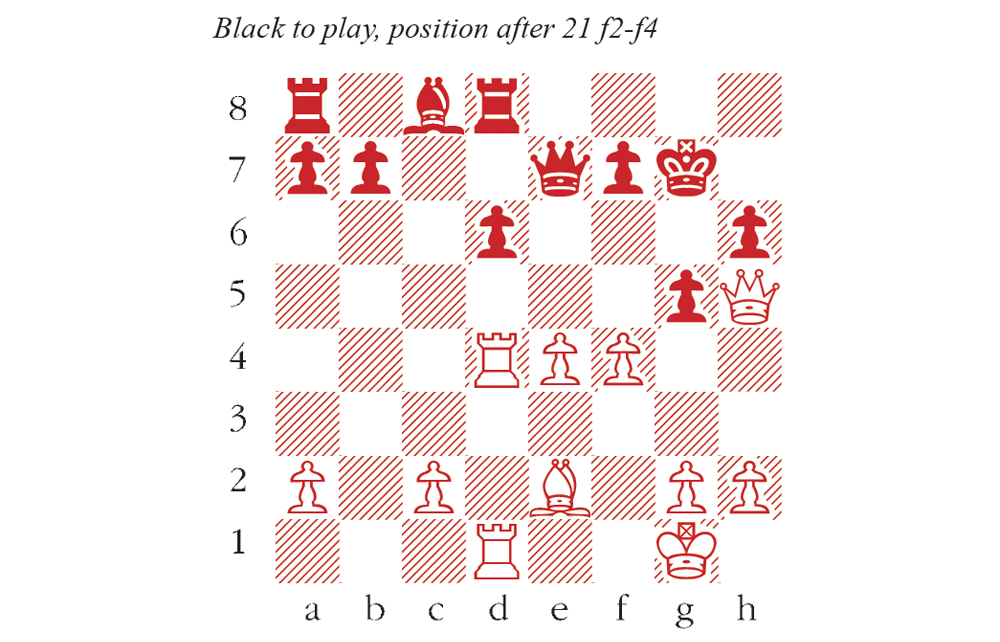 White’s f2-f4 push has increased the pressure, but the best response was to grab it: 21…gxf4 Then 22 e5! looks scary, but 22…Qg5 23 exd6 Be6 still offers reasonable hopes of survival.