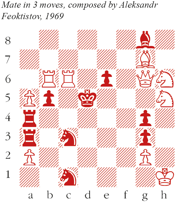 That’s where I got stuck. For one thing, the irrational position (see diagram below) made me dizzy. Composed by Aleksandr Feoktistov in 1969, the task is for White to play and give mate in three moves or fewer. Black’s king is immobilised in the centre, and there are countless ways to threaten mate on the next move, but three moves is a tough constraint to meet, given the range of defensive resources. For example, 1 Nxg4 threatens mate with Ng4-e3, and then 1…Rxg4 2 Qxg4 N1e2 (to prevent Qg4-d4#) 3 Rd6+ Kc5 4 Rbc6 mate is four moves – that’s one too many.