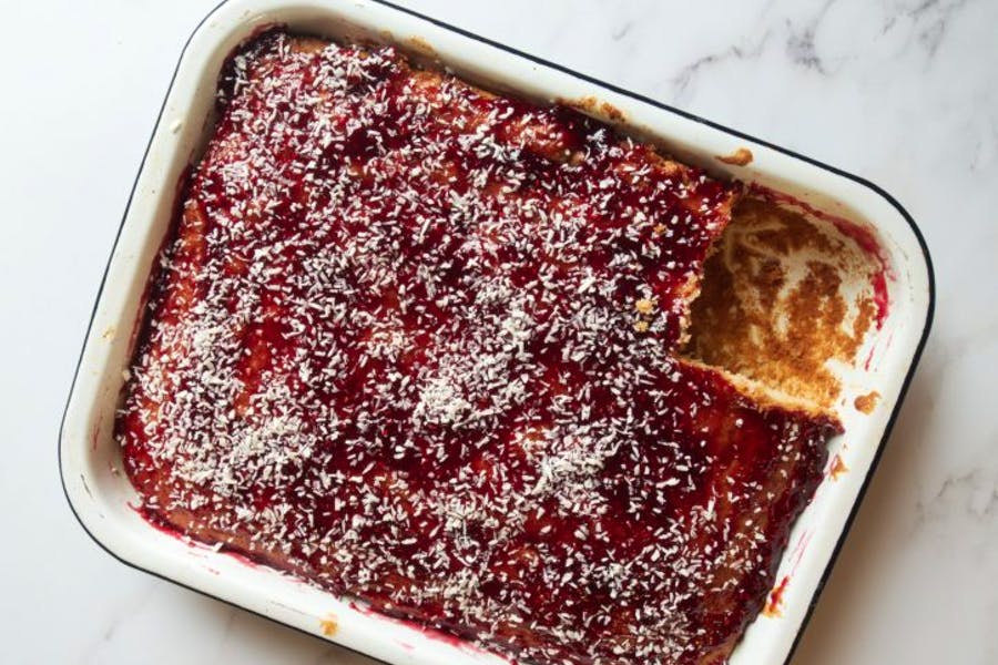 I’ve gone for a cake which relies on store cupboard staples, one which you might recognise from school dinners: raspberry and coconut traybake. It’s straightforward, and doesn’t require any fancy ingredients: it’s essentially a pound cake, made up of equal quantities butter, flour, eggs and sugar. It’s then decorated with simple long-life staples: jam and desiccated coconut. Thanks to the panic-buying that has happened, the butter, eggs and flour that we have taken for granted are harder to come by. So we might need to be a little more inventive. But I want you to feel confident that you can use what you have to engineer that succour and satisfaction that baking should bring.