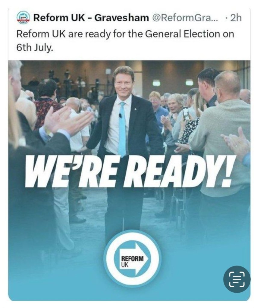 So it was so somewhat unfortunate then that in their haste to hail the forthcoming election they, er, get the date wrong. On their Twitter/X account, Reform Gravesham proudly announced that it was ‘ready for the General Election on 6th July’. That will come as news to the rest of the country which is preparing to go to the polls when they are actually open on Thursday 4 July. The now-deleted tweet showed a smiling Tice shaking hands emblazoned with the words ‘We’re ready!’