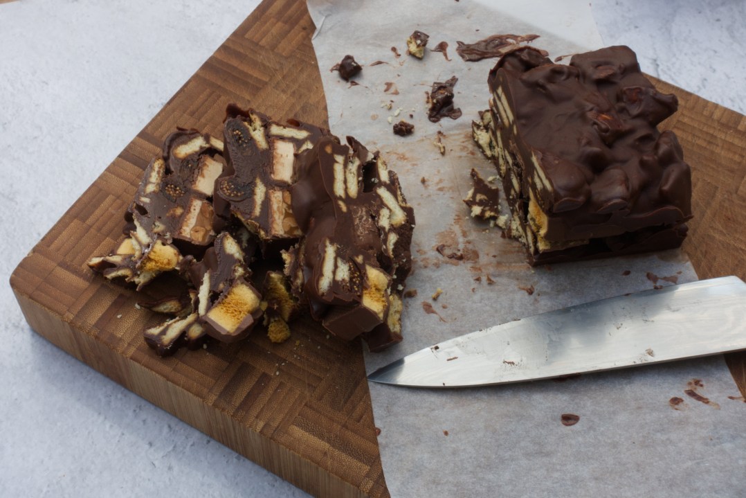 Where my refrigerator cake differs from the more traditional tiffin, is that I set whole chocolate bars into it.