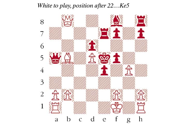 1 e4 c5 2 Nf3 Nc6 3 d4 cxd4 4 Nxd4 Nf6 5 Nc3 e5 The defining move of the Sveshnikov Sicilian. 6 Ndb5 d6 7 Bg5 a6 8 Bxf6 gxf6 9 Na3 b5 10 Nd5 f5 It was once thought that White’s proud knight on d5 and clean pawn structure promised a good game. These days, the merits of Black’s setup are better appreciated. The bishop pair is a great asset, and the scrappy mass of pawns should not be underestimated, while the Na3 has yet to rejoin the fray. 11 Bd3 Be6 12 c4 Qa5+ 13 Kf1 Bxd5 14 exd5 Nd4 15 cxb5 axb5 16 Nc2 Nxc2 17 Qxc2 e4 18 Qc6+ Ke7 19 Bxb5 Ra7 20 Qe8+ Kf6 21 g4 Re7 22 Qb8 Ke5 (see diagram) The most outlandish moves are often played for the simplest reasons. This one defends the d6-pawn, creating the unexpected threat of …Bf8-g7, trapping the White queen on b8. 23 f4+ Kxf4 24 Ke2 24 Qxd6+ Re5! 25 Qc6 Qd2 and Black maintains some initiative. 24 Be2 was better, preparing Qb8-b3. Ke5 As simple as that! The king is safe now. 25 Rhf1 fxg4 26 b4 Laying a trap, since 26…Qxb4 27 Rf5+ Kxf5 28 Bd7+ wins. Bg7 27 bxa5 27 Qxh8 Qxb5+ wins, as White is in check! Rxb8 28 Rab1 f5 29 a6 f4 The a-pawn is easily restrained, but the tide of kingside pawns cannot be abated. 30 Bc6 f3+ 31 Kf2 Rxb1 32 Rxb1 Kf4 33 Rb4 Bc3 34 Rc4 Ba5 35 Kf1 Bb6 36 Bb7 h5 37 Rc6 e3 38 Rc4+ Kg5 White resigns