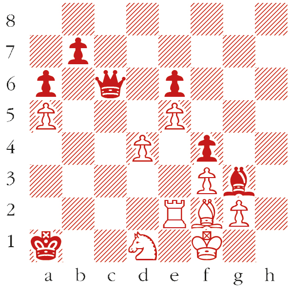 1 d5 Qxd5 If Black captures with the pawn, the e-pawn’s advance is too strong. 2 Ra2+!! Qxa2 King moves allow an immediate knight fork 3 Bd4+ Kb1 4 Nc3+ Kb2 5 Nxa2+ Kxa2 Now the real action begins. 6 Bf2 Bh2 With the king so far away on a2, Black must decline the exchange of bishops. For example, 6…Bxf2 7 Kxf2 Kb3 8 g4 wins 7 Bg1 Bg3 There appears to be an impasse: 8 Ke2 Kb3 9 Kd3 Kb4 10 Bb6 is drawn. 8 Bh2!! An astonishing solution Bxh2 9 g4 Timman wrote ‘Recently I read about someone who wanted to abolish the en passant rule. The game of chess would lose a lot of its beauty in that case.’ fxg3 After 9…Bg3 10 g5 the pawn is unstoppable. 10 Kg2! Now the Bh2 is locked in, so the pawn march can begun. Kb3 11 f4 Kc4 12 f5 Kd5 13 f6 White wins