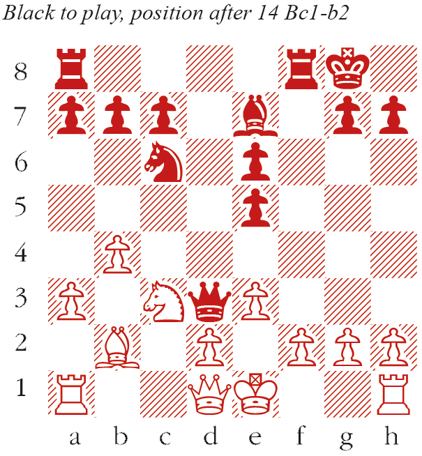1 c4 Nf6 2 Nc3 e5 3 e3 Nc6 4 Nge2 Be7 5 a3 d5 6 cxd5 Nxd5 7 Nxd5 Qxd5 8 Nc3 Qd6 9 Bc4 O-O 10 b4 Be6 11 Nb5 Qd7 12 Bxe6 fxe6 13 Nc3 Qd3 14 Bb2? Already the decisive mistake (see diagram 1) Nd4!! A masterstroke, with the ingenious point that 15 exd4 is met by 15…Rxf2!! 16 Kxf2 Rf8+ and now 17 Kg1? Qxd4 is mate (revealing the point of the knight sacrifice). Alternatively, 17 Ke1 Bh4+ 18 g3 Bxg3+ leads to mate. 15 Rc1 There is no other way to meet the threat of Nd4-c2+ Bh4 16 Rf1 Qf5! Inducing the decisive weakness 17 g3 Nf3+ 18 Ke2 Rad8 19 d3 Ng1+! White resigns before a blow lands on d3 or f2.