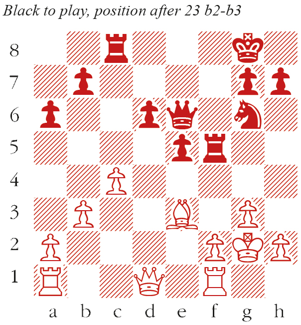 23…e4! Seizing the initiative. The Ng6 is striving to reach the f3 square. 24 Qd4 24 Rc1! was more stubborn, preparing to meet 24…Ne5 with 25 Qd5! Rh5! 25 Rh1 Qh3+ 26 Kg1 Re8 27 Qxd6 Kh8! 27…Ne5 fails to 28 Qd5+, but now the knight is bound for f3. 28 Bd4 Rg5! The key idea, preparing Ng6-h4. 29 Bxg7+ Kxg7 30 Qd4+ Kh6 31 Rd1 Nh4 White resigns
