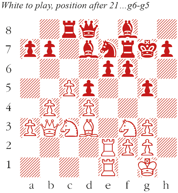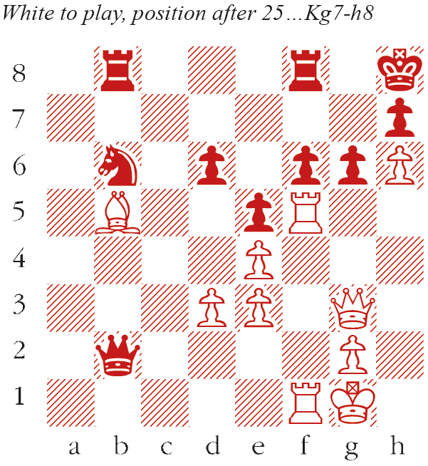 26 Qg5!! Neither queen nor rook can be captured, somewhat reminiscent of the brilliant finish to Levitsky-Marshall, Breslau 1912. Qxb5 27 Rxf6 Rfe8 28 Rxg6 Nd7 29 Rg7 Black resigns as 29…Rg8 prevents Rxh7+ but then 30 Qe7 wins. A magnificent finish.
