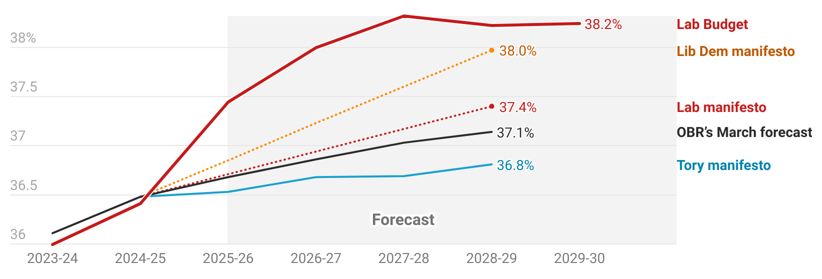 Mr S’s friends at The Spectator’s DataHub have crunched all the manifestos put out at the time to see just who really would be responsible for the greatest tax hikes – with some rather interesting results. After removing the Green eco-zealots (who planned to raise the tax burden off the scale of any graph), the Lib Dems were in the lead. Sir Ed Davey’s lot would have taken the tax burden to a staggering 38 per cent of GDP – matching a post-war high. And Labour? Starmer’s lefty lot wouldn’t be anywhere near that, voters were repeatedly reassured.