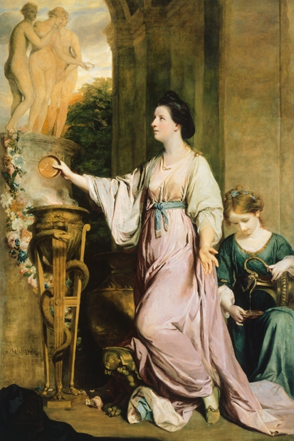 Gainsborough seldom gives you such an intimate sense of an individual, especially a female one, as this. On the other hand, he didn’t ever come a cropper in the way that Reynolds intermittently did. One of the qualities that made Reynolds so good was his ability to add ingredients to his portraits: painting Sterne at once as conventional clergyman and subversive satyr, for example. But he was also tempted to add extra value by blending his genres. Sometimes Reynolds stirred mythology into the visual mix, resulting in improbable pictures of English ladies impersonating classical nymphs such as ‘Lady Elizabeth Keppel Adorning a Term of Hymen’ (1761), ‘Lady Sarah Bunbury Sacrificing to the Graces’ (1762) or ‘Mrs Hale as “Euphrosyne” ’ (1762-4).