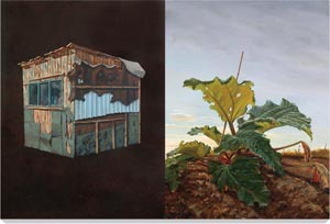 Skilled in the layered and luminous techniques of the Old Masters, Perry paints the sheds on single panels or paired with vegetables on a diptych, as if floating against a featureless ground. The neutrality of these plain or stippled backgrounds is checked by the evident affection of his detailing of flaking paint, rotting wood and peeling asphalt. Never has Perry’s subject married so well with his meticulous methods of painting, and never have his methods been put to better use. These pictures are superbly painted. The small panels are perhaps the most immediately attractive, but the large ‘No Door Shed’ on a white ground, for instance, is exquisitely rendered and conceived. These paintings are not only a memorable tribute to a dying urban sub-culture but also stunning formal explorations of what paint can do in a thoroughly contemporary way.