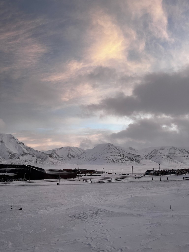 The quiet hillside by Longyearbyen’s church gives visitors to the capital of Norway’s Svalbard archipelago an austere but beautiful panorama of the bay that cradles the town. Tall, sharply steep mountains, blanketed with snow, collide with the blue-grey waters of the Arctic below.