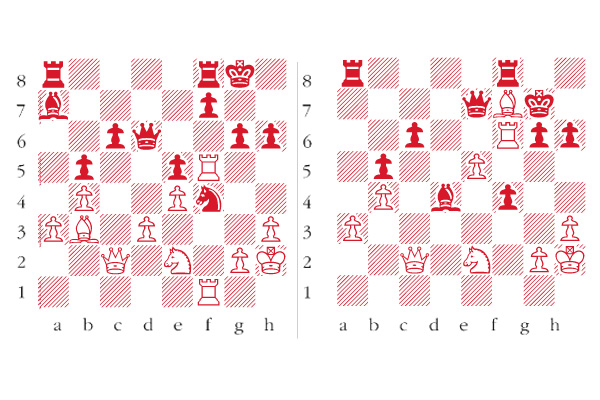 1 e4 e5 2 f4 Bc5 3 Nf3 d6 4 c3 Bg4 5 fxe5 dxe5 6 Qa4+ Bd7 7 Qc2 Nc6 8 b4 Bd6 9 Bc4 Nf6 10 d3 Ne7 10 … 0-0 should be met by 11 Qe2 since 11 0-0 b5 12 Bb3 a5 13 bxa5 Nxa5 14 Bg5 Nxb3 15 Qxb3 h6 16 Bh4 Qe7 17 Kh1 Qe6 was better for Black in Day-Zwaig, Skopje 1972. 11 0-0 Ng6 12 Be3 b5 13 Bb3 a5 14 a3 axb4 15 cxb4 0-0 15 … Bxb4? would be met by 16 Ng5 0-0 17 Nxf7 Rxf7 18 Bxf7+ Kxf7 19 Qb3+ Be6 20 Qxb4 winning. 16 Nc3 c6 17 h3 Qe7 18 Ne2 Bb8 The idea is to pivot at a7 and get rid of White’s powerful e3-bishop. 18 … Nh5 is also possible. 19 Kh2 Ba7 20 Bg5 h6 21 Bxf6 Qxf6 22 Nfd4 Qd6 23 Nf5 Bxf5 24 Rxf5 Nf4 25 Rf1 g6 (see diagram 1) 26 R1xf4 A bold sacrifice – and a real one, since there is no forced win. 26 … exf4 This is the wrong recapture. Necessary is 26…gxf5 27 Rxf5 Be3 28 Qc3 when the position is in dynamic equilibrium. 27 e5 Taking control of f6. 27 … Qe7 28 Rf6 Kg7 The king belongs on h8. If 28 … Qxe5 then 29 Rxg6+ Kh7 30 d4 Qxe2 31 Qxe2 fxg6 32 Qe7+ Kh8 33 Qe5+ Kh7 34 Qc7+ Kh8 35 Qxc6 Bxd4 36 Qxg6 and Black is in deep trouble. 29 d4 Bxd4 30 Bxf7 (see diagram 2) 30 … Bxe5 30 … Rxf7 would have held out longer but White’s victory is now inevitable: 31 Qxg6+ Kf8 32 Nxd4 Rxf6 33 exf6 Qf7 34 Qxh6+ Ke8 35 Qxf4. 31 Qxg6+ Black resigns
