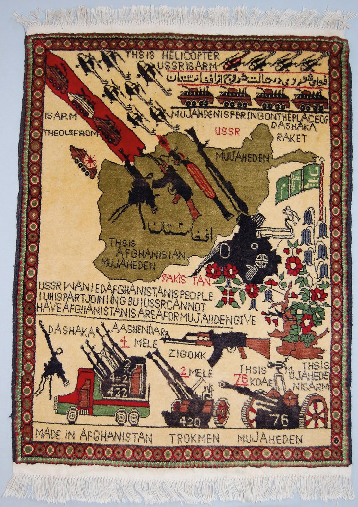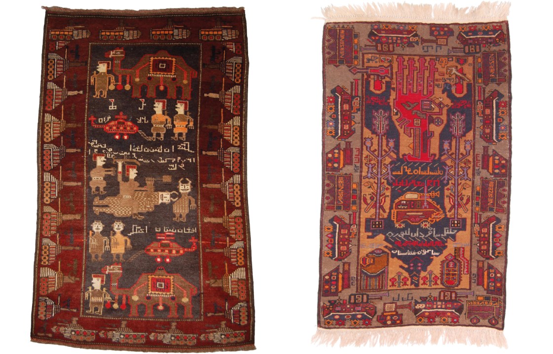The war rugs, depicting camels and flowers alongside rocket launchers, are striking and jarring