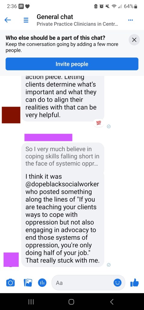 Another therapist chimed in, “I think it was @dopeblacksocialworker who posted something along the lines of ‘If you are teaching your clients ways to cope with oppression but not also engaging in advocacy to end those systems of oppression, you’re only doing half of your job.'”