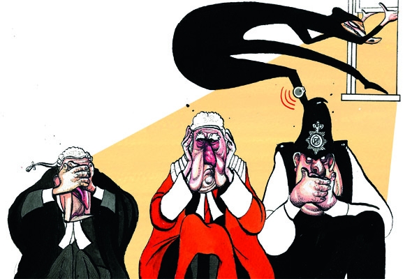 Yesterday’s Sunday Times splashed on an investigation into why police are giving cautions to violent criminals, rather than arresting them, to cut down on paperwork. We sum this up in our cover illustration by Morten Morland who portrays the judges and coppers as the three monkeys. It’s a a policy of see no crime, hear no crime and speak no crime.