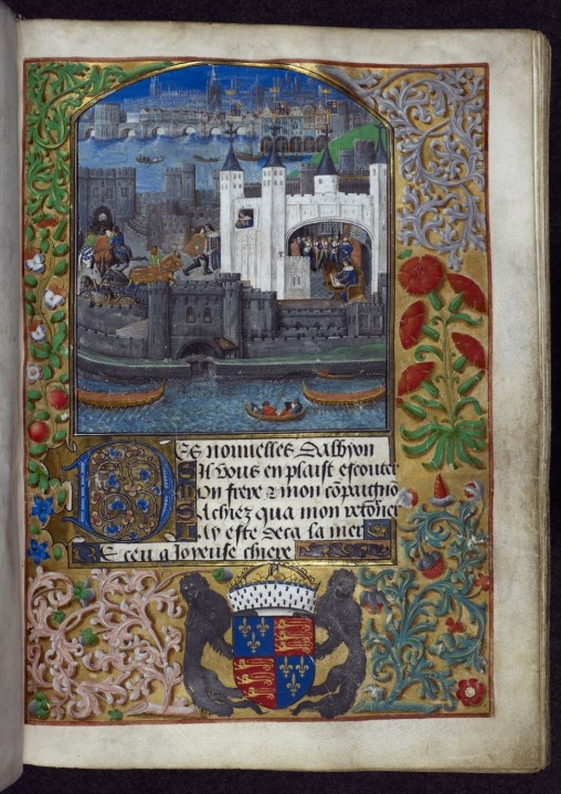 That hazy suggestion becomes more apparent when you see the extravagant illustrations in volumes of courtly literature. The oral traditions of Arthurian tales and chivalric romances were all committed to paper and decorated to taste; they would then be performed for the king’s amusement. Edward IV, for instance, commissioned an edition of French Prince Charles d’Orleans’ poems, which the latter had written when in captivity in London at the height of the Hundred Years War. Around the margins of the verse, the artist depicted Charles imprisoned in the Tower of Edward’s magnificent London: a sign of the king’s pride in his thriving capital and of his private ambitions to rule France.