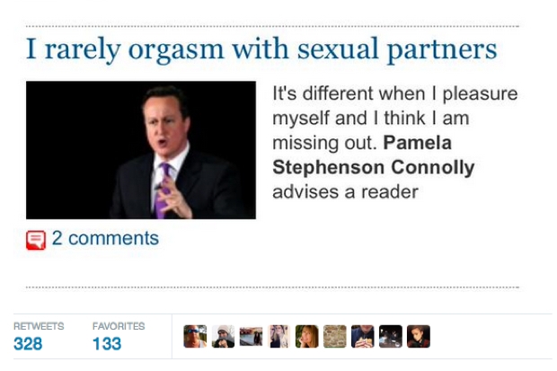 Readers of the Guardian had cause to splutter into their tea this morning after one bright spark seemingly put the wrong photo on an article advising a reader who has difficulty reaching climax during sexual intercourse.