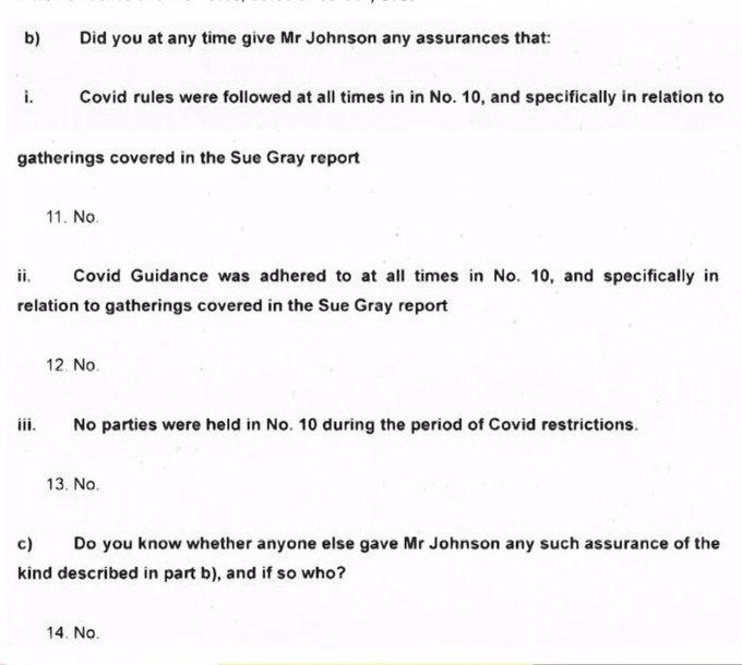 The Privileges Committee have today released a final 100-page dossier of material before Johnson’s 2 p.m showdown. And one of the pieces of written evidence is a pithy submission by Case in which he denies that he gave any assurances to the then prime minister that ‘Covid rules were followed at all times’, ‘Covid guidance was adhered to at all times’ and that ‘no parties were held in No. 10’. By contrast, Johnson’s Parliamentary Private Secretary Sarah Dines MP told the committee she was ‘90 per cent sure’ that she heard Case’s voice at a meeting in which Johnson was told that his staff had followed the rules ‘at all times’.