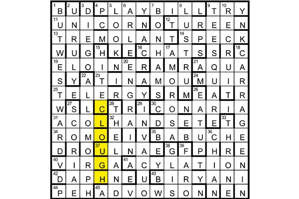 The part quotation was ‘BUT WESTWARD, LOOK, THE LAND’ (1/5/28) from Say not the struggle naught availeth by Arthur Hugh Clough. Remaining unclued lights, read from right to left (‘westward’), each contain a ‘land’: Libya (4), Oman (23), Iran (30), Cuba (35) and Italy (41). CLOUGH (in the fourth column) was to be shaded.