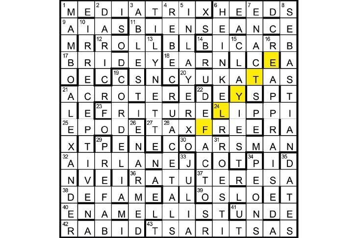 The suggested title is Brideshead Revisited, HEEDS/RABID (6A/42) being an anagram of BRIDESHEAD. The six characters, all members of the Flyte family, are ALEXANDER (Lord Marchmain) (21D), TERESA (Lady Marchmain) (37), and their children, BRIDEY (17), SEBASTIAN (8), JULIA (33) and CORDELIA (19). FLYTE (diagonally from the eighth row) was to be shaded.