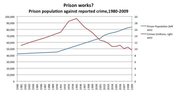 I thought that CoffeeHousers might appreciate a few graphs to steer them around the prisons debate. It’s by no means a complete overview of the issue, but just three of the trends that hover over Ken Clarke’s proposals: