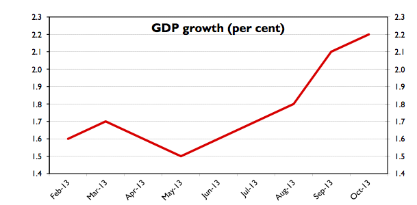 Things are lining up nicely for George Osborne’s Autumn Statement next month (and fairly badly for Ed Miliband, who’s making his economic speech today). For the first time since he became Chancellor, he will be able to report forecasts better, not worse, than his previous suggestions. The European Commission has just upped its UK growth forecast for next year to 2.2 per cent, up from 1.7 per cent – the largest upgrade of any European country. The Eurocrats are, of course, just catching up with the changing independent consensus. The graph pictured above (from the Treasury) shows how the consensus for 2014 growth has been revised upwards month after month.